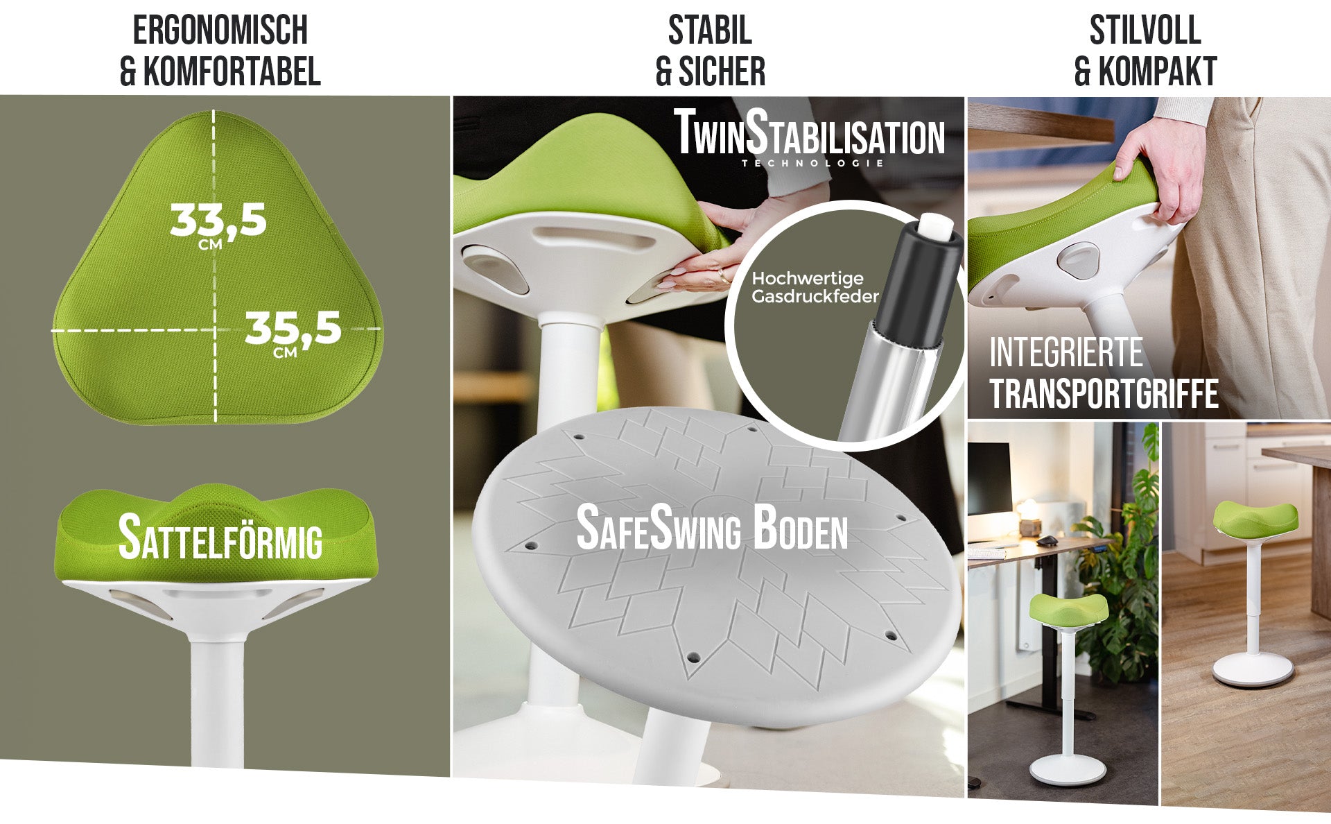 Der Test hebt insbesondere die erstklassige Ergonomie, die hochwertige Verarbeitung und den auรergewรถhnlichen Sitzkomfort unseres Hockers hervor. Die innovative Kombination aus DynamicComfort Design, TwinStabilisation Technologie und dem SafeSwing Boden รผberzeugte in allen relevanten Bereichen: Stabilitรคt, Flexibilitรคt, Sicherheit und Gesundheit.